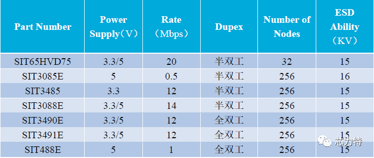 芯力特成為擁有全雙工、半雙工、5V供電、3.3V供電,滿足高速、中速、低速通訊應(yīng)用的全品類、高品質(zhì)RS485廠商。各品類典型型號如下。